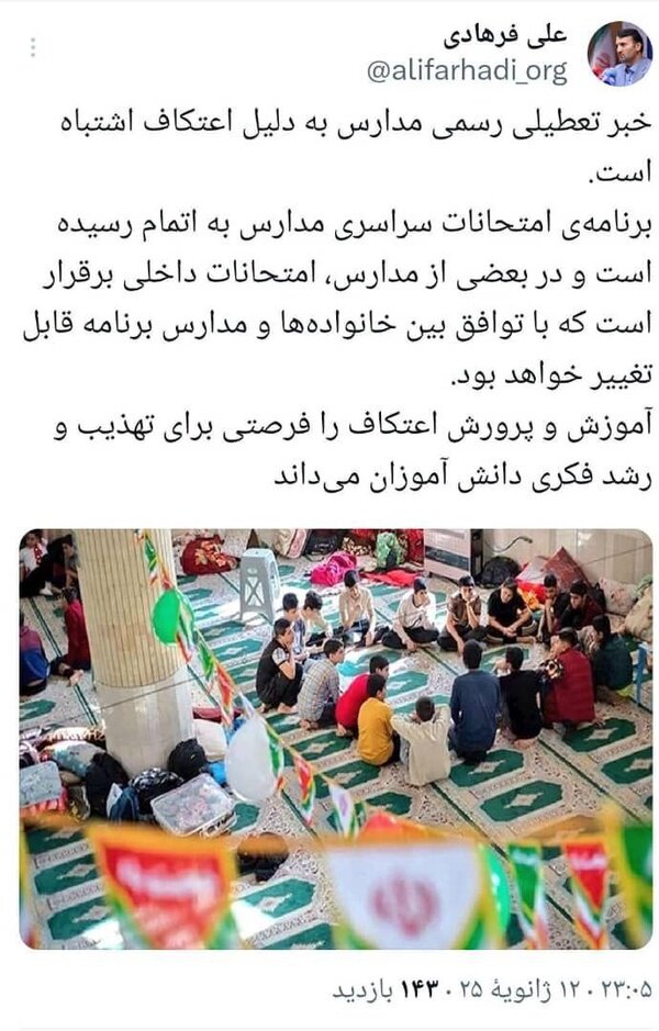 علی فرهادی سخنگوی وزارت آموزشوپرورش در صفحه شخصی خود در فضای مجازی نوشت: خبر تعطیلی رسمی مدارس به دلیل اعتکاف اشتباه است.