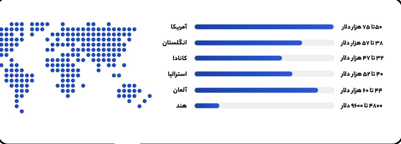در این نمودار متوسط درآمد سالیانه توسعهدهندگان وردپرس در چند کشور مطرح در حوزه فناوری مقایسه شده است.
