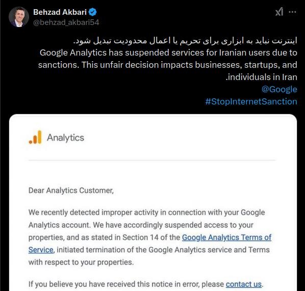 همین ماجرا بهزاد اکبری معاون وزیر ارتباطات را به واکنش واداشت. اکبری در توییتر نوشت: «اینترنت نباید به ابزاری برای تحریم یا اعمال محدودیت تبدیل شود. سرویسهای گوگل آنالیتیکس به خاطر تحریمها برای کاربران ایرانی تعلیق شده است. این تصمیم ناعادلانه در ایران به کسبوکارها، استارتآپها و افراد ضربه میزند.»