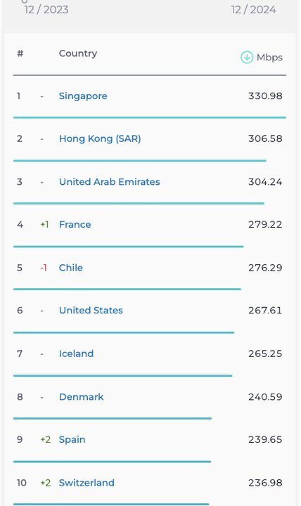 در رده چهارم فرانسه با میانه سرعت ۲۷۹.۲۲ مگابیت برثانیه قرار دارد که جایگاه آن نسبت به نوامبر ۲۰۲۴ میلادی یک پله صعود کرده است. اما شیلی که در رده پنجم قرار دارد که جایگاه آن نسبت به نوامبر ۲۰۲۴ میلادی یک پله سقوط کرده است. میانه سرعت اینترنت ثابت این کشور ۲۷۶.۲۹ مگابیت برثانیه است.