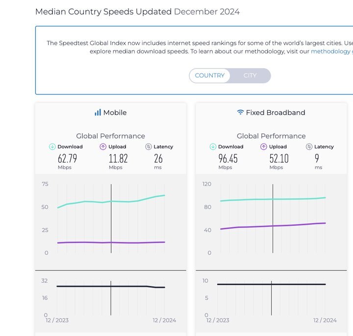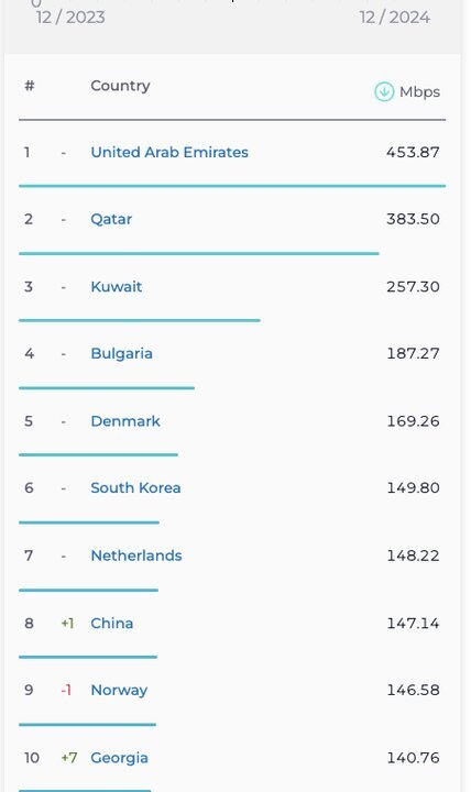 این درحالی است که یک ماه قبل از آن (نوامبر ۲۰۲۴ میلادی) میانه اینترنت موبایل جهان ۶۱.۵۲ و میانه اینترنت ثابت جهانی ۹۵.۱۰ مگابیت برثانیه بوده است.