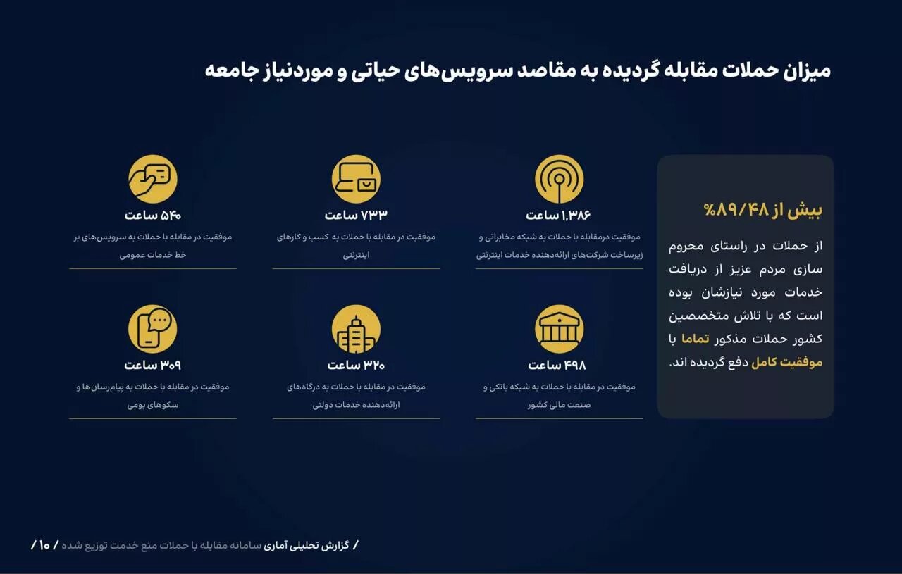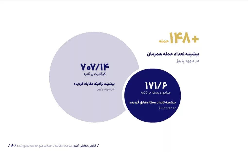 گزارش شرکت ارتباطات زیرساخت حاکی از آن است که در اوج حملات سایبری پاییز گذشته، همزمان بیش از ۱۴۸ حمله به زیرساختهای کشور انجام شده است. برای مقابله با این حجم عظیم از حملات بیش از ۷۰۷ گیگابیتبرثانیه ترافیک و ۱۷۱ میلیون و ۶۰۰ هزار بسته پردازش شده است.