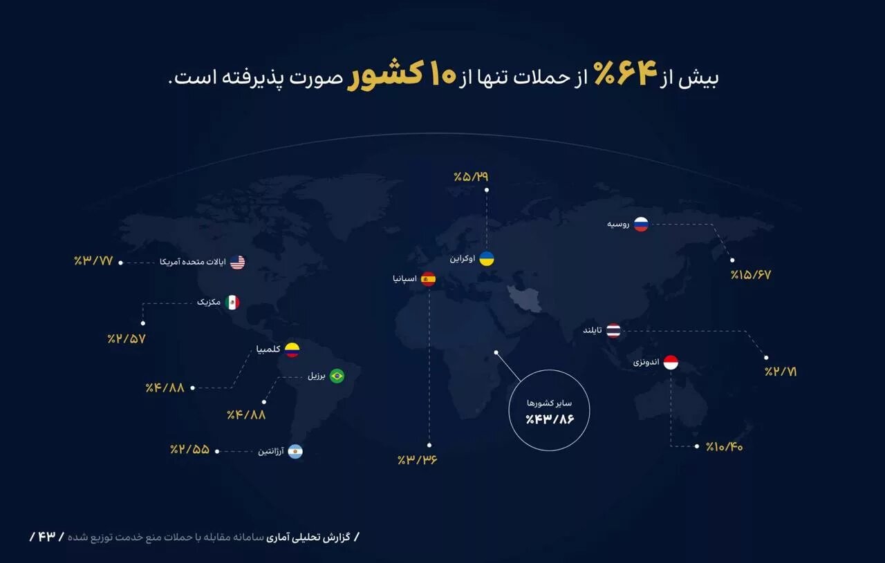همچنین بیش از ۶۴ درصد حملات از مبدأ ۱۰ کشور انجام شده است. روسیه بزرگترین منبع حملات شناسایی شده است. اندونزی و اوکراین نیز بهترتیب در رتبههای بعدی قرار دارند.