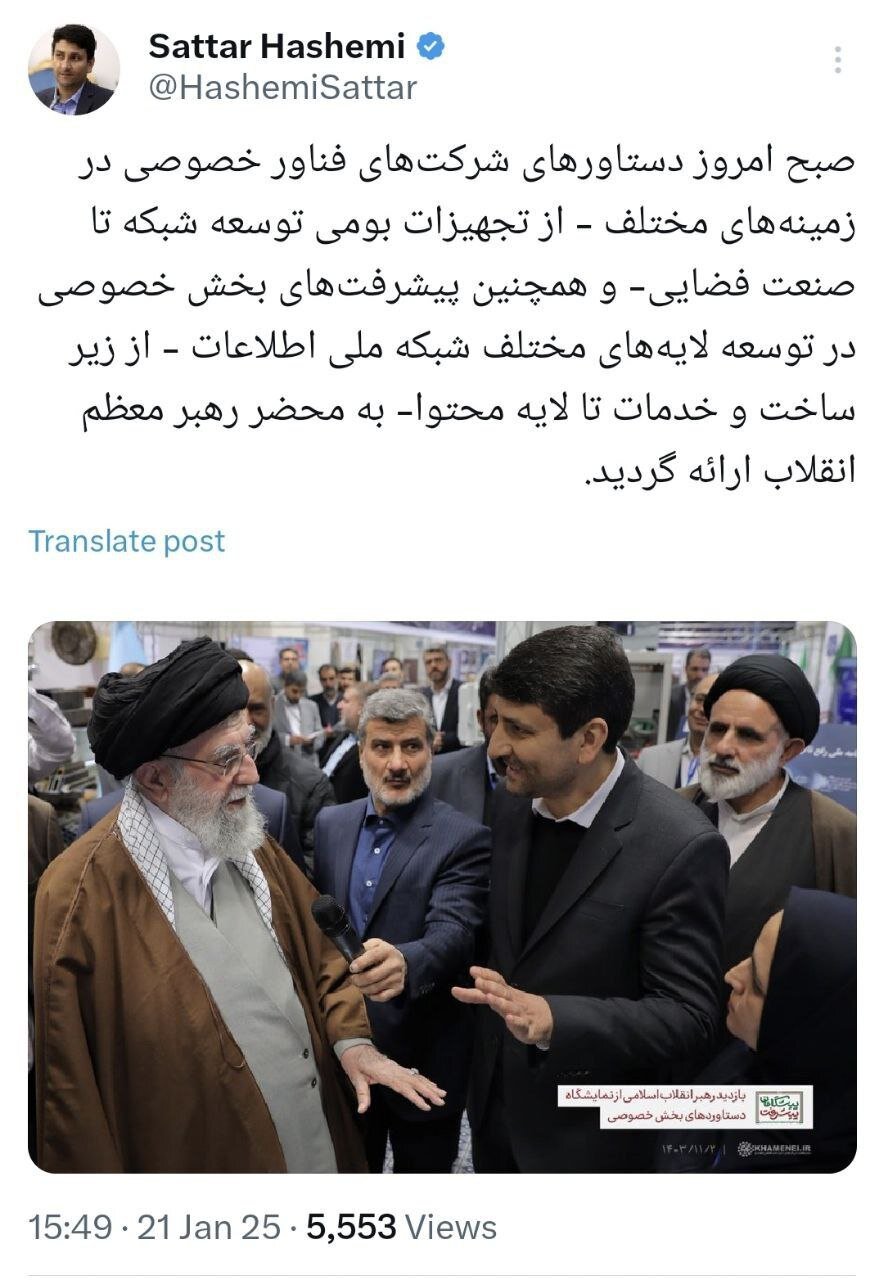 ستار هاشمی، وزیر ارتباطات و فناوری اطلاعات در همین رابطه نوشت: «صبح امروز دستاوردهای شرکتهای فناور خصوصی در زمینههای مختلف – از تجهیزات بومی توسعه شبکه تا صنعت فضایی – و همچنین پیشرفتهای بخش خصوصی در توسعه لایههای مختلف شبکه ملی اطلاعات – از زیرساخت و خدمات تا لایه محتوا – به محضر رهبر معظم انقلاب ارائه گردید.»
