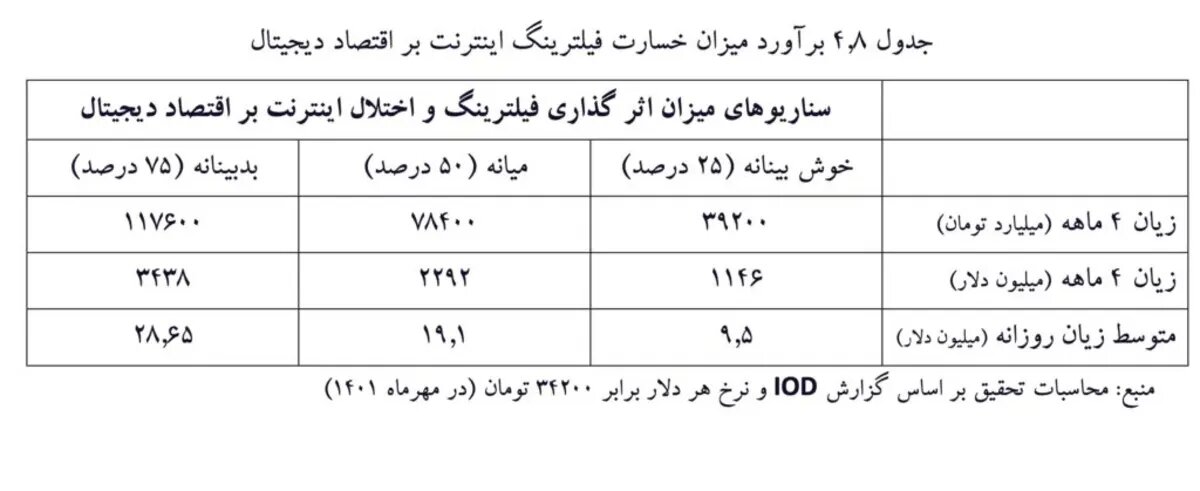 در ادامه نیز سه سناریوی احتمالی با رویکردهای خوشبینانه، میانه و بدبینانه در خصوص میزان اثرگذاری فیلترینگ بر کسبوکارها در نظر گرفته شده که طبق آن، در خوشبینانهترین حالت زیان ۴ ماه به کسبوکارها ۲۵ درصد برآورد شده و بنابراین، در این بازه زمانی کسبوکارها در مجموع ۳۹ هزار و میلیارد و ۲۰۰ میلیون تومان آسیب دیدهاند که معادل ۱۱۶۰ میلیون دلار در ۴ ماه بوده است. بنابراین، میزان ضرر روزانه کسبوکارها ۹.۵ میلیون دلار برآورد شده است.