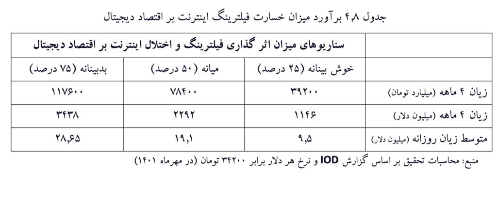 با استفاده از این داده‌ها و سناریوهای مختلف، گزارش پایگاه داده باز ایران تخمین زده است فیلترینگ اینترنت در سال ۱۴۰۱ به‌طور متوسط ماهانه حدود ۳۹ هزار میلیارد و ۲۰۰ میلیون تومان به اقتصاد دیجیتال کشور خسارت وارد کرده است.