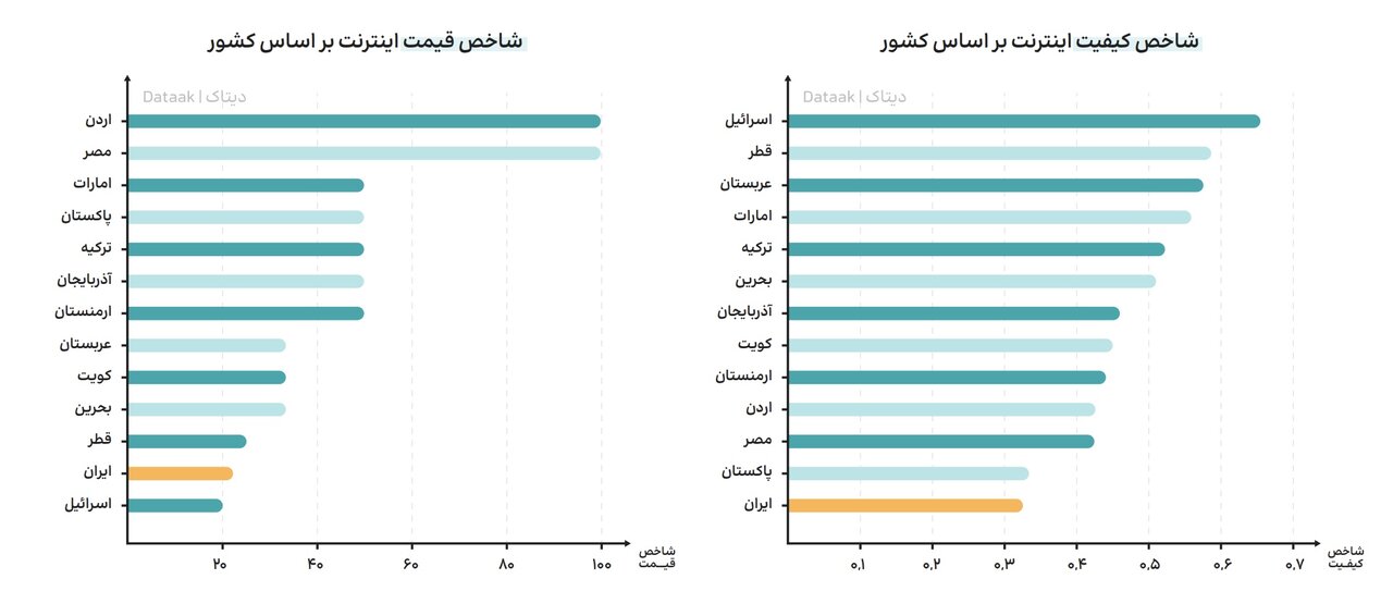 - قعرنشینی در خاورمیانه: در نمودار کیفیت، ایران در انتهای لیست کشورهای خاورمیانه، پس از اردن، مصر، امارات، پاکستان و ترکیه قرار دارد. در عین حال، در نمودار قیمت (بر اساس دلار آزاد)، اینترنت ایران گرانتر از کشورهایی مانند کویت و عربستان است. این به معنی دریافت کیفیت پایین در ازای قیمتی نسبتاً بالا است.