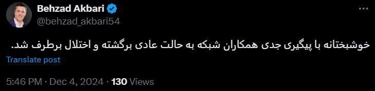 بهزاد اکبری که پیش از این از پیگیری برای رفع مشکل صحبت کرده بود، در توییتر خبر از رفع اختلال داد و نوشت: «خوشبختانه با پیگیری جدی همکاران شبکه به حالت عادی برگشته و اختلال برطرف شد.»