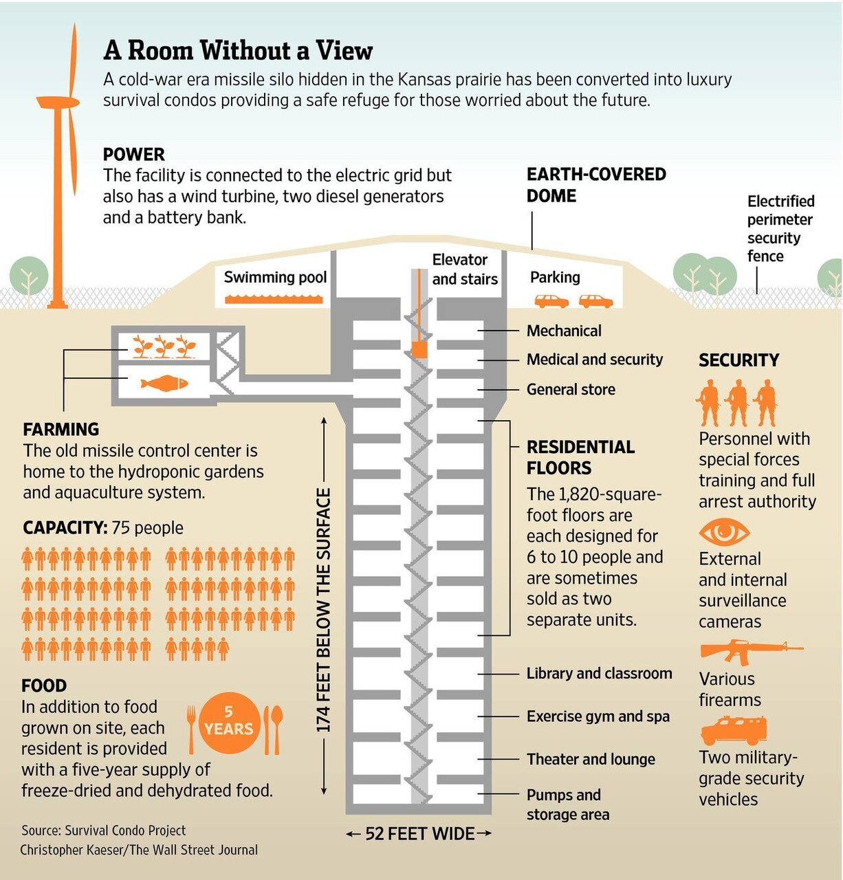اما در سال ۲۰۰۸، لری هال، یک توسعهدهنده آمریکایی، یکی از این سیلوها را خریداری کرد و پس از صرف ۲۰ میلیون دلار، آن را به پناهگاهی مدرن و مجهز تبدیل کرد. او معتقد بود که در جهانی پر از خطرات جدید، باید مکانهایی برای زنده ماندن و حفظ استانداردهای زندگی فراهم شود.