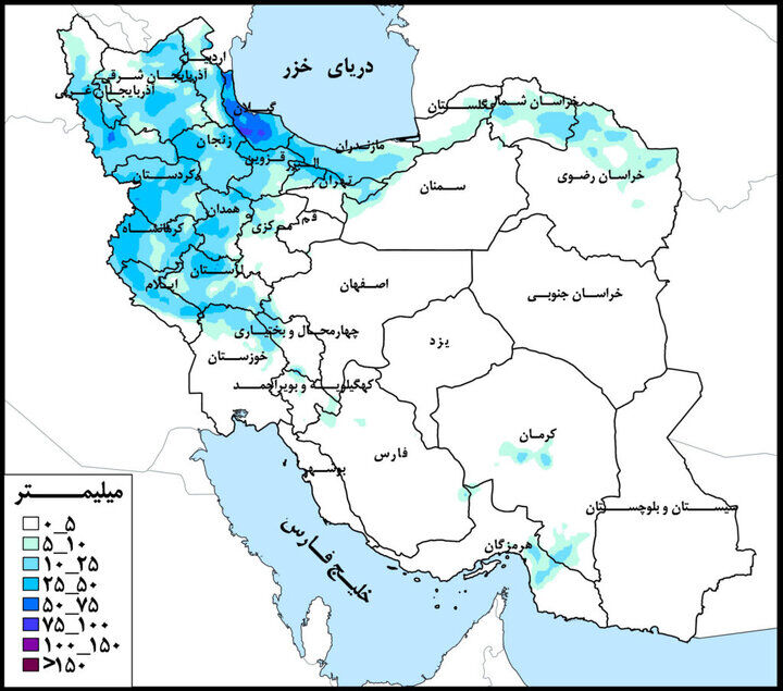 استانهای گیلان، مازندران و استانهای غربی کشور با بارش تجمعی ۵۰ تا ۷۵ میلیمتر در هفته جاری پربارشترین استانهای کشور خواهند بود.